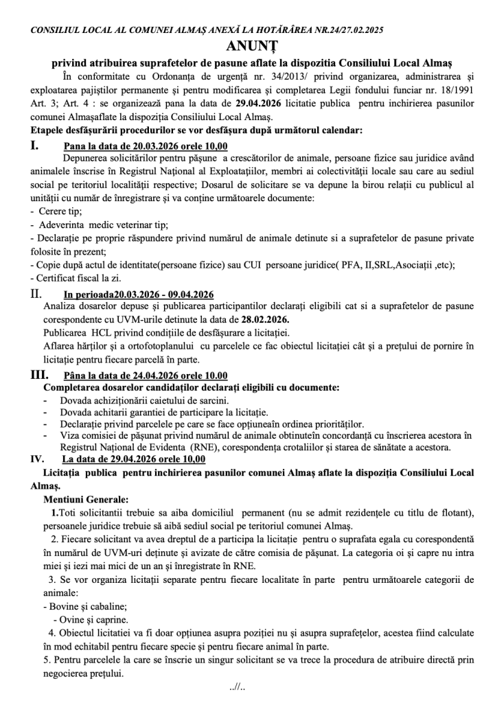 Anunț privind atribuirea suprafetelor de pășune aflate la dispoziția Consiliului Local Almaș 2 martie 202627 februarie 2026 Anunt Pasune cerere pasune Declaratie pe proprie raspundere pasune citește mai departe…