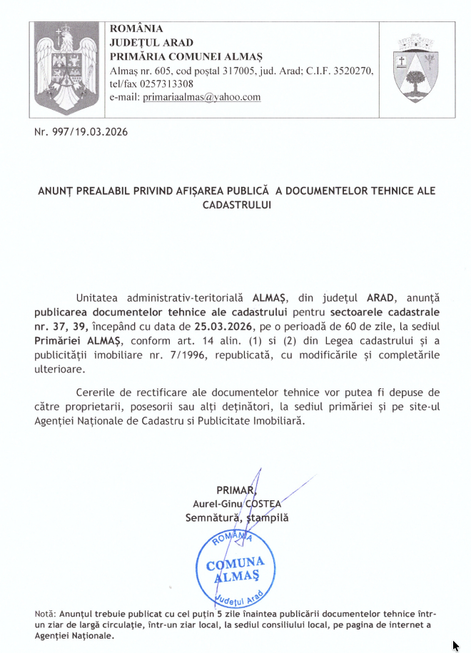 ANUNȚ PREALABIL PRIVIND AFIȘAREA PUBLICĂ A DOCUMENTELOR TEHNICE ALE CADASTRULUI 19 martie 2026 Anuntul prealabil ziar, site PUBLICARE FINANTAREA 10 PNCCF SC PRECAD TOPO SRL Mihaela Precup.pdf