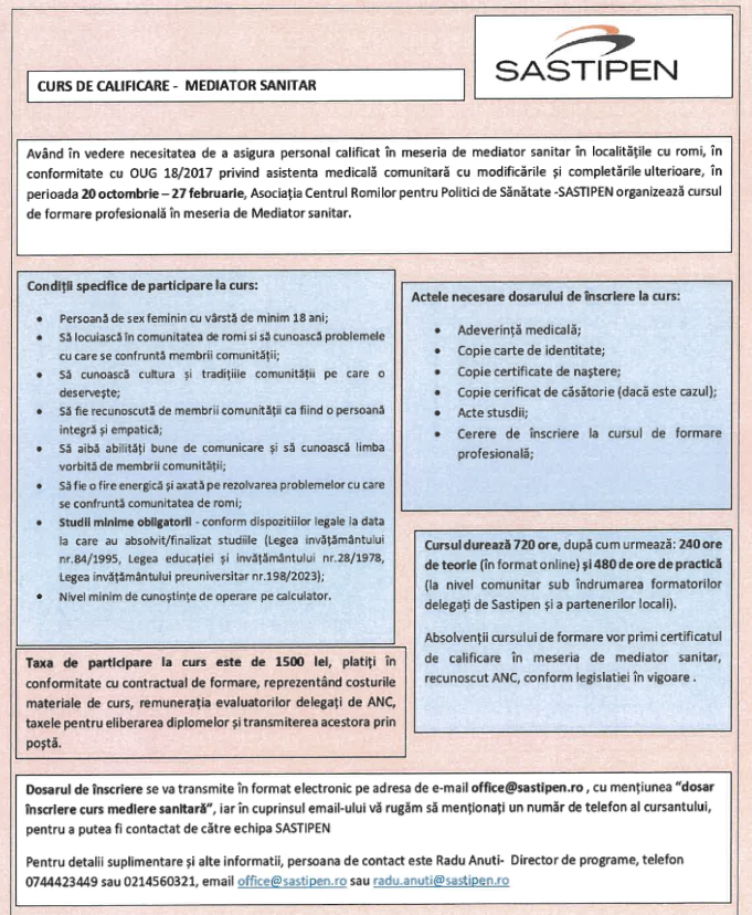Asociațoa Centrul Romilor pentru Politici de Sănătate- SASTIPEN – organizare curs de calificare – MEDIATOR SANITAR 16 octombrie 2025 citește mai departe…